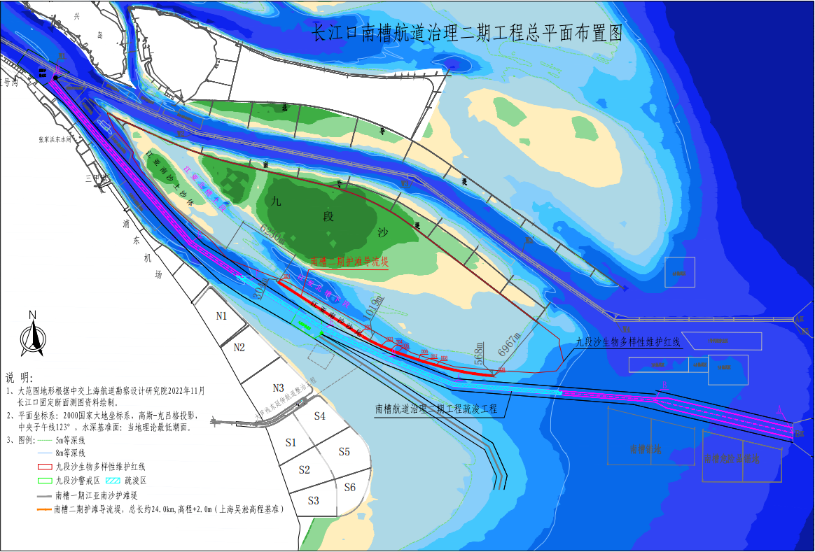 “深南槽”方面:2018年至2021年,交通运输部长江口航道管理局实施了长江口南槽航道治理一期工程,建成了86公里水深6米的南槽航道,实现了5000吨级船舶满载乘潮双向通航。按照全国港口与航道布局规划要求,正加快南槽航道治理二期工程的前期工作,目前,已获国家发展改革委批复立项,近期将开工建设。工程建成后,南槽航道水深将达8米,实现1万吨级船舶满载乘潮双向通航。届时,“一主一辅”两条航道将达标运行。