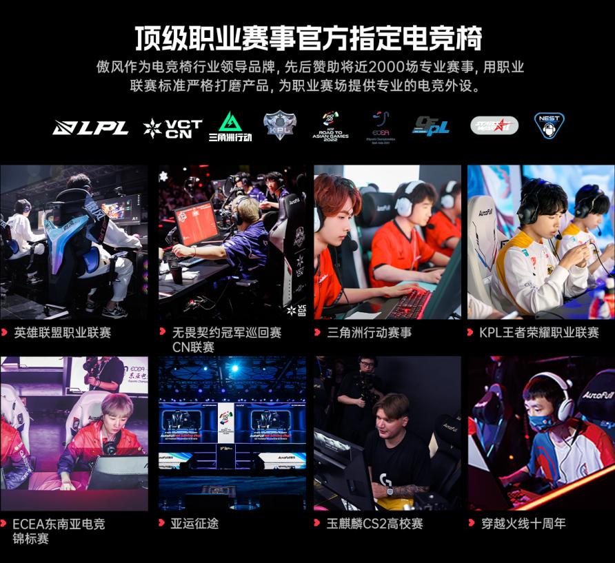 从傲风旗下的M6产品作为2025-2026年无畏契约冠军巡回赛CN联赛指定电竞椅,到其G7电竞椅成为2025-2026年英雄联盟职业联赛指定电竞椅——“想赢坐傲风”早已不止于口号:作为电竞椅行业领导品牌,傲风已先后赞助将近2000场专业赛事,包含LPL、VCT CN、KPL、亚运征途等顶级职业赛事,同时也在全国联赛、高校赛事和女子赛事的第一线,致力于提供最专业最舒适的电子竞技外设体验。目前,傲风已与众多赛事活动举办方达成战略合作伙伴关系,一起见证电竞赛事的每一场胜局。