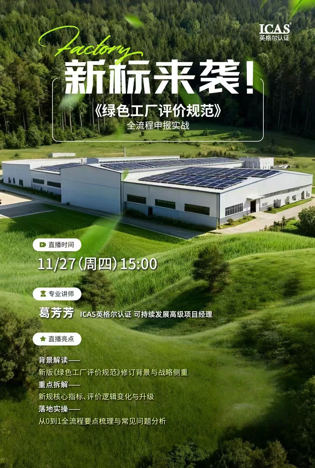中企视讯(编辑 郭艺珺)在“双碳”目标深入推进与制造业高质量发展的双重背景下,绿色工厂已成为企业践行低碳转型、提升核心竞争力的重要载体。11月27日,ICAS英格尔认证开展“《绿色工厂评价规范》全流程申报实战”为主题的线上直播讲座,深度解读2025年10月国家工信部发布的绿色工厂申报新规,围绕政策调整核心、评价指标升级及申报实操注意事项等关键内容,为广大制造业企业适配新标申报提供了系统性指引,覆盖众多行业企业关注的核心痛点。