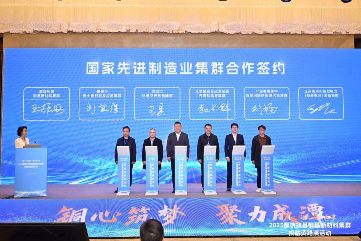 会议现场,鹰饶抚昌铜基新材料集群联合赣州市稀土新材料及应用集群、青岛市轨道交通装备集群、京津冀安全应急装备先进制造业集群、广深佛惠莞中智能网联新能源汽车集群、江苏南京市新型电力(智能电网)装备集群等6个国家先进制造业集群在开幕式上共同签署《2025年国家先进制造业集群跨区域协同发展备忘录》,明确围绕集群间生态互联互通、创新资源共享、应用场景共建等方面开展系统性合作,构建协同联动、开放融通的产业集群发展新范式。