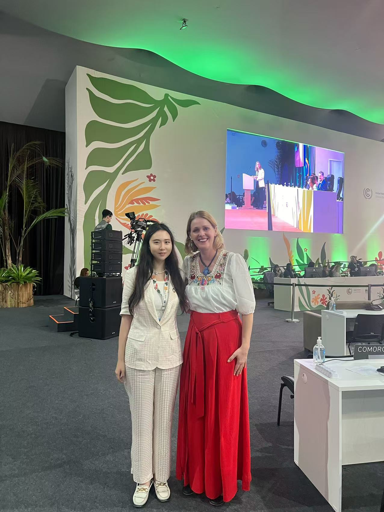 图片说明: GFPIA代表段晓奕(左)与匈牙利气候特使Barbara Botos(右)在会议期间交流探讨