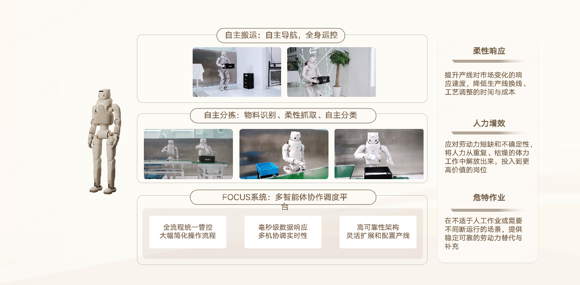 面向制造业与物流行业的产业数字化升级需求,傅利叶人形机器人解决方案提供物品搬运、自动码垛、产线上下料、智能分拣与视觉质检等能力支持,聚焦柔性响应、人力增效与危特作业三大价值维度: