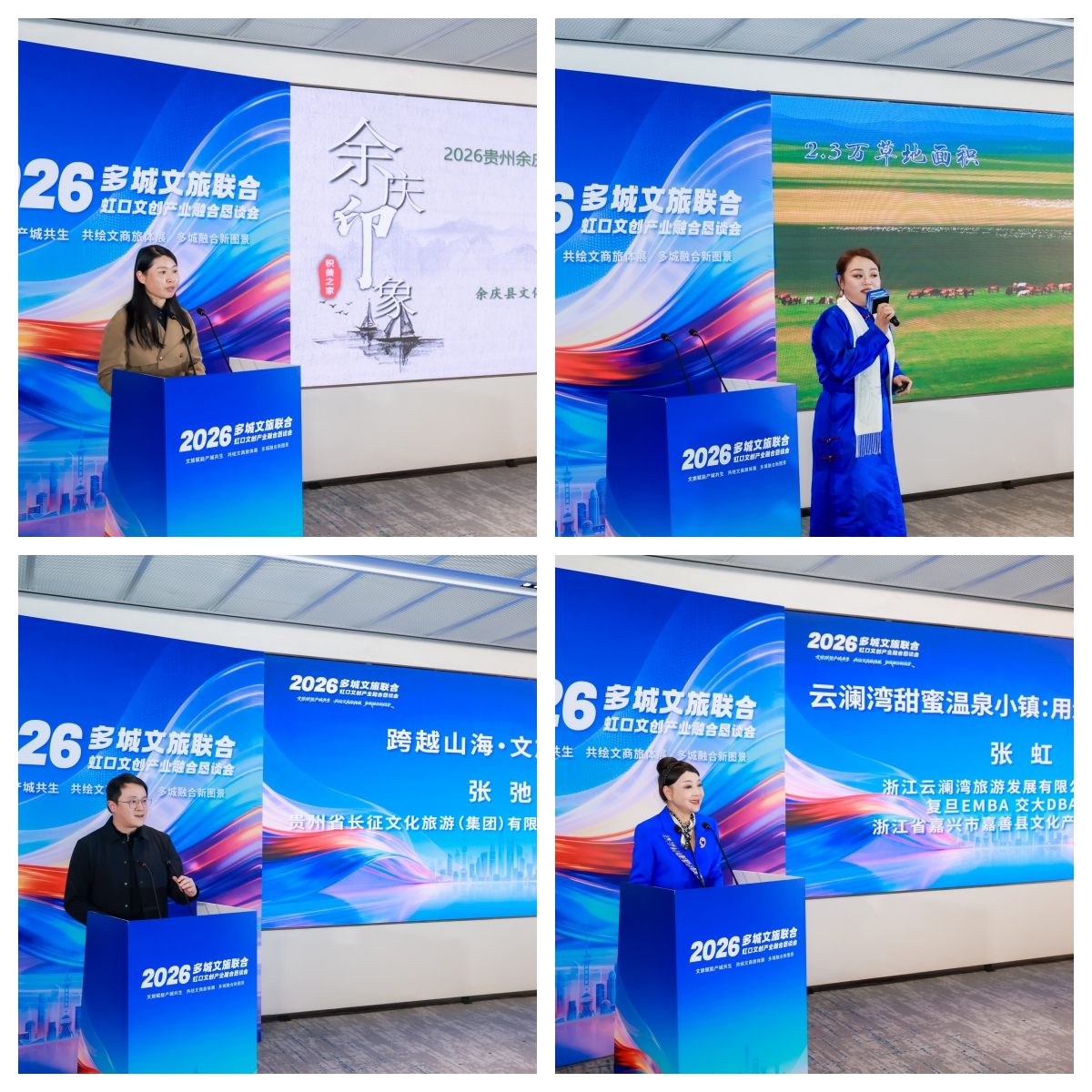 主题分享环节内容丰富、亮点纷呈。多地文旅代表依次登场,全方位展示本地特色文旅资源与产业融合成果:贵州余庆县文旅局局长骆科艳介绍了乌江流域生态文旅资源;内蒙古西乌珠穆沁旗文旅推介官乌日罕则展现了草原民俗文化与文旅产业融合的独特魅力。浙江云澜湾旅游发展有限公司董事长张虹分享了以“浪漫”为核心的温泉文旅IP打造经验;贵州长征文化旅游(集团)有限公司张弛展现红色文旅与自然风光的深度融合。